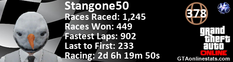 <a href="http://GTAonlinestats.com/showplayer/Stangone50"><img src="http://GTAonlinestats.com/racesignature/Stangone50/sig.png" alt="Stangone50" border="0" /></a>