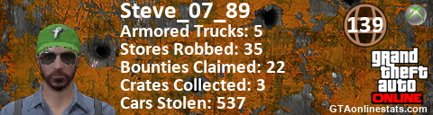 [URL=http://GTAonlinestats.com/showplayer/Steve_07_89][IMG]http://GTAonlinestats.com/signature/Steve_07_89/sig.png[/IMG][/URL]