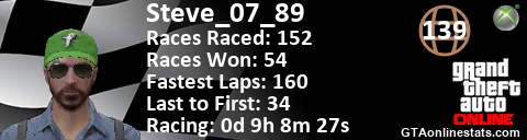 [URL=http://GTAonlinestats.com/showplayer/Steve_07_89][IMG]http://GTAonlinestats.com/racesignature/Steve_07_89/sig.png[/IMG][/URL]