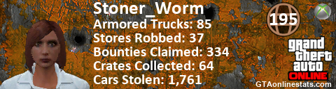 [URL=http://GTAonlinestats.com/showplayer/Stoner_Worm][IMG]http://GTAonlinestats.com/randomsignature/Stoner_Worm/sig.png[/IMG][/URL]