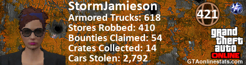 [URL=http://GTAonlinestats.com/showplayer/StormJamieson][IMG]http://GTAonlinestats.com/signature/StormJamieson/sig.png[/IMG][/URL]