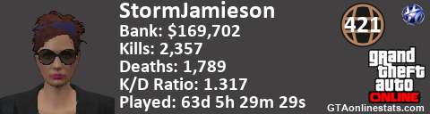[URL=http://GTAonlinestats.com/showplayer/StormJamieson][IMG]http://GTAonlinestats.com/randomsignature/StormJamieson/sig.png[/IMG][/URL]