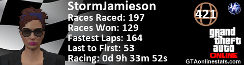 [URL=http://GTAonlinestats.com/showplayer/StormJamieson][IMG]http://GTAonlinestats.com/racesignature/StormJamieson/sig.png[/IMG][/URL]