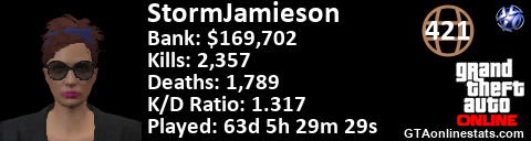 <a href="http://GTAonlinestats.com/showplayer/StormJamieson"><img src="http://GTAonlinestats.com/signature/StormJamieson/sig.png" alt="StormJamieson" border="0" /></a>