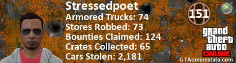 [URL=http://GTAonlinestats.com/showplayer/Stressedpoet][IMG]http://GTAonlinestats.com/randomsignature/Stressedpoet/sig.png[/IMG][/URL]