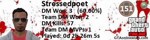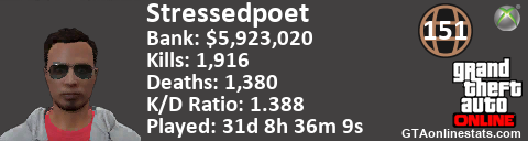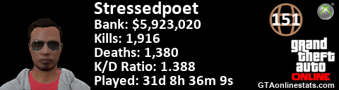 <a href="http://GTAonlinestats.com/showplayer/Stressedpoet"><img src="http://GTAonlinestats.com/dmsignature/Stressedpoet/sig.png" alt="Stressedpoet" border="0" /></a>
