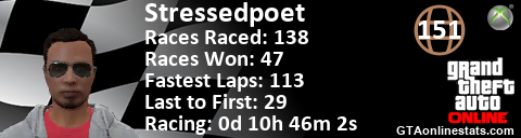 <a href="http://GTAonlinestats.com/showplayer/Stressedpoet"><img src="http://GTAonlinestats.com/racesignature/Stressedpoet/sig.png" alt="Stressedpoet" border="0" /></a>