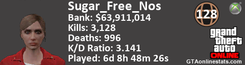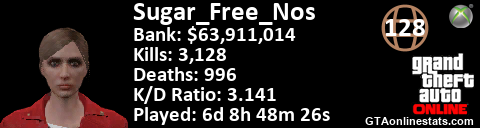 [URL=http://GTAonlinestats.com/showplayer/Sugar_Free_Nos][IMG]http://GTAonlinestats.com/signature/Sugar_Free_Nos/sig.png[/IMG][/URL]
