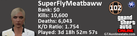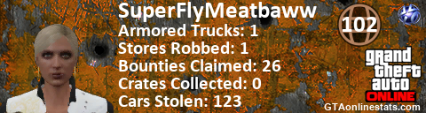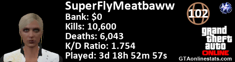 <a href="http://GTAonlinestats.com/showplayer/SuperFlyMeatbaww/3"><img src="http://GTAonlinestats.com/signature/SuperFlyMeatbaww/3/sig.png" alt="SuperFlyMeatbaww" border="0" /></a>