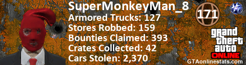 [URL=http://GTAonlinestats.com/showplayer/SuperMonkeyMan_8][IMG]http://GTAonlinestats.com/crimesignature/SuperMonkeyMan_8/sig.png[/IMG][/URL]