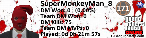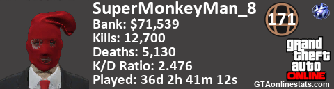 [URL=http://GTAonlinestats.com/showplayer/SuperMonkeyMan_8][IMG]http://GTAonlinestats.com/signature/SuperMonkeyMan_8/sig.png[/IMG][/URL]