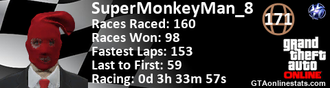[URL=http://GTAonlinestats.com/showplayer/SuperMonkeyMan_8][IMG]http://GTAonlinestats.com/racesignature/SuperMonkeyMan_8/sig.png[/IMG][/URL]