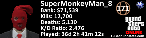 <a href="http://GTAonlinestats.com/showplayer/SuperMonkeyMan_8"><img src="http://GTAonlinestats.com/signature/SuperMonkeyMan_8/sig.png" alt="SuperMonkeyMan_8" border="0" /></a>
