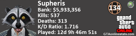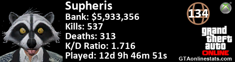 [URL=http://GTAonlinestats.com/showplayer/Supheris][IMG]http://GTAonlinestats.com/signature/Supheris/sig.png[/IMG][/URL]