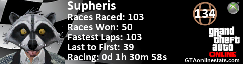[URL=http://GTAonlinestats.com/showplayer/Supheris][IMG]http://GTAonlinestats.com/racesignature/Supheris/sig.png[/IMG][/URL]