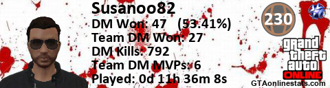 [URL=http://GTAonlinestats.com/showplayer/Susanoo82/2][IMG]http://GTAonlinestats.com/dmsignature/Susanoo82/2/sig.png[/IMG][/URL]