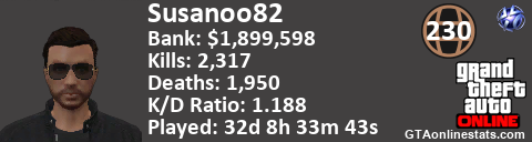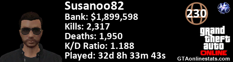 [URL=http://GTAonlinestats.com/showplayer/Susanoo82/2][IMG]http://GTAonlinestats.com/greysignature/Susanoo82/2/sig.png[/IMG][/URL]