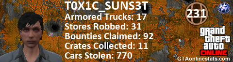 [URL=http://GTAonlinestats.com/showplayer/T0X1C_SUNS3T][IMG]http://GTAonlinestats.com/crimesignature/T0X1C_SUNS3T/sig.png[/IMG][/URL]