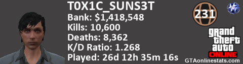 [URL=http://GTAonlinestats.com/showplayer/T0X1C_SUNS3T][IMG]http://GTAonlinestats.com/signature/T0X1C_SUNS3T/sig.png[/IMG][/URL]