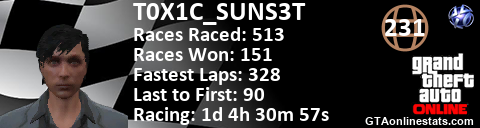 <a href="http://GTAonlinestats.com/showplayer/T0X1C_SUNS3T"><img src="http://GTAonlinestats.com/racesignature/T0X1C_SUNS3T/sig.png" alt="T0X1C_SUNS3T" border="0" /></a>