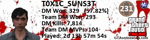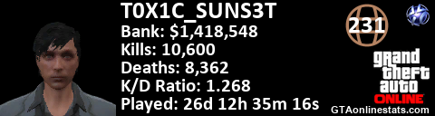 <a href="http://GTAonlinestats.com/showplayer/T0X1C_SUNS3T"><img src="http://GTAonlinestats.com/dmsignature/T0X1C_SUNS3T/sig.png" alt="T0X1C_SUNS3T" border="0" /></a>