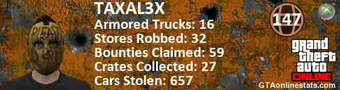 [URL=http://GTAonlinestats.com/showplayer/TAXAL3X][IMG]http://GTAonlinestats.com/crimesignature/TAXAL3X/sig.png[/IMG][/URL]