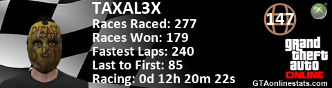 [URL=http://GTAonlinestats.com/showplayer/TAXAL3X][IMG]http://GTAonlinestats.com/racesignature/TAXAL3X/sig.png[/IMG][/URL]