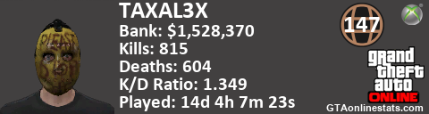 [URL=http://GTAonlinestats.com/showplayer/TAXAL3X][IMG]http://GTAonlinestats.com/signature/TAXAL3X/sig.png[/IMG][/URL]