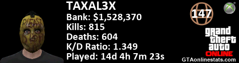 <a href="http://GTAonlinestats.com/showplayer/TAXAL3X"><img src="http://GTAonlinestats.com/signature/TAXAL3X/sig.png" alt="TAXAL3X" border="0" /></a>