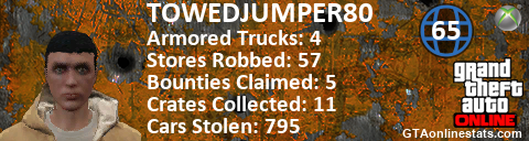 [URL=http://GTAonlinestats.com/showplayer/TOWEDJUMPER80][IMG]http://GTAonlinestats.com/crimesignature/TOWEDJUMPER80/sig.png[/IMG][/URL]