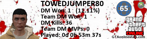 [URL=http://GTAonlinestats.com/showplayer/TOWEDJUMPER80][IMG]http://GTAonlinestats.com/dmsignature/TOWEDJUMPER80/sig.png[/IMG][/URL]