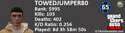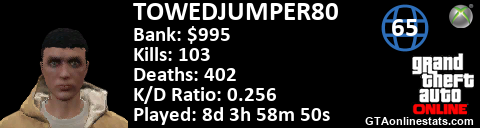 <a href="http://GTAonlinestats.com/showplayer/TOWEDJUMPER80"><img src="http://GTAonlinestats.com/randomsignature/TOWEDJUMPER80/sig.png" alt="TOWEDJUMPER80" border="0" /></a>