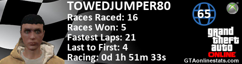 <a href="http://GTAonlinestats.com/showplayer/TOWEDJUMPER80"><img src="http://GTAonlinestats.com/racesignature/TOWEDJUMPER80/sig.png" alt="TOWEDJUMPER80" border="0" /></a>