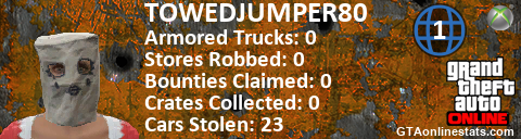[URL=http://GTAonlinestats.com/showplayer/TOWEDJUMPER80/2][IMG]http://GTAonlinestats.com/crimesignature/TOWEDJUMPER80/2/sig.png[/IMG][/URL]