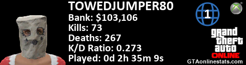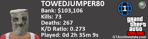 <a href="http://GTAonlinestats.com/showplayer/TOWEDJUMPER80/2"><img src="http://GTAonlinestats.com/randomsignature/TOWEDJUMPER80/2/sig.png" alt="TOWEDJUMPER80" border="0" /></a>