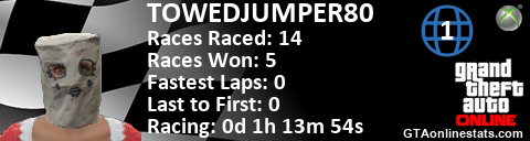 [URL=http://GTAonlinestats.com/showplayer/TOWEDJUMPER80/2][IMG]http://GTAonlinestats.com/racesignature/TOWEDJUMPER80/2/sig.png[/IMG][/URL]