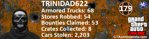 [URL=http://GTAonlinestats.com/showplayer/TRINIDAD622/2][IMG]http://GTAonlinestats.com/crimesignature/TRINIDAD622/2/sig.png[/IMG][/URL]