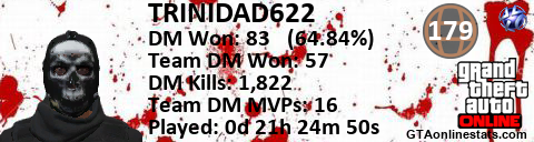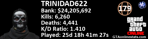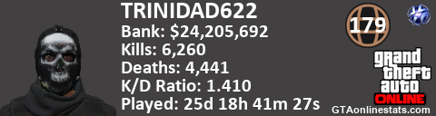 [URL=http://GTAonlinestats.com/showplayer/TRINIDAD622/2][IMG]http://GTAonlinestats.com/signature/TRINIDAD622/2/sig.png[/IMG][/URL]