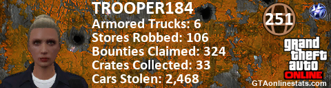 [URL=http://GTAonlinestats.com/showplayer/TROOPER184][IMG]http://GTAonlinestats.com/crimesignature/TROOPER184/sig.png[/IMG][/URL]