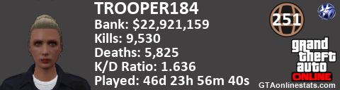 [URL=http://GTAonlinestats.com/showplayer/TROOPER184][IMG]http://GTAonlinestats.com/signature/TROOPER184/sig.png[/IMG][/URL]