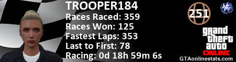 <a href="http://GTAonlinestats.com/showplayer/TROOPER184"><img src="http://GTAonlinestats.com/racesignature/TROOPER184/sig.png" alt="TROOPER184" border="0" /></a>