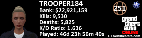 <a href="http://GTAonlinestats.com/showplayer/TROOPER184"><img src="http://GTAonlinestats.com/randomsignature/TROOPER184/sig.png" alt="TROOPER184" border="0" /></a>