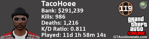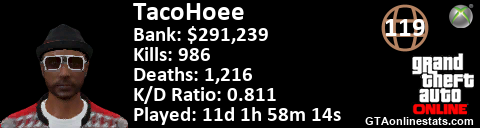 <a href="http://GTAonlinestats.com/showplayer/TacoHoee"><img src="http://GTAonlinestats.com/signature/TacoHoee/sig.png" alt="TacoHoee" border="0" /></a>