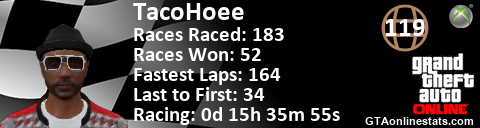 [URL=http://GTAonlinestats.com/showplayer/TacoHoee][IMG]http://GTAonlinestats.com/racesignature/TacoHoee/sig.png[/IMG][/URL]
