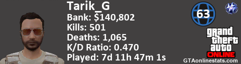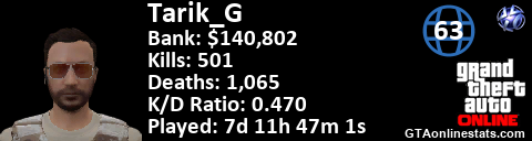 <a href="http://GTAonlinestats.com/showplayer/Tarik_G"><img src="http://GTAonlinestats.com/signature/Tarik_G/sig.png" alt="Tarik_G" border="0" /></a>