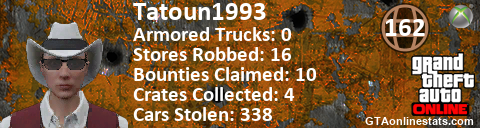 [URL=http://GTAonlinestats.com/showplayer/Tatoun1993][IMG]http://GTAonlinestats.com/greysignature/Tatoun1993/sig.png[/IMG][/URL]