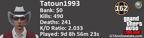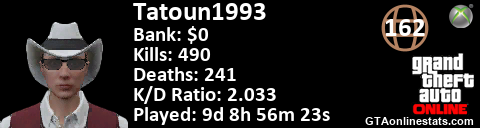 <a href="http://GTAonlinestats.com/showplayer/Tatoun1993"><img src="http://GTAonlinestats.com/dmsignature/Tatoun1993/sig.png" alt="Tatoun1993" border="0" /></a>
