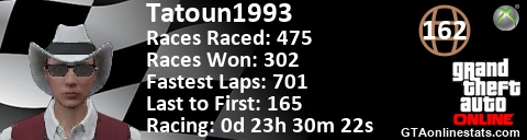 [URL=http://GTAonlinestats.com/showplayer/Tatoun1993][IMG]http://GTAonlinestats.com/racesignature/Tatoun1993/sig.png[/IMG][/URL]