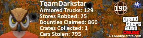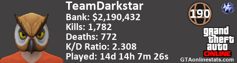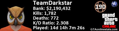 [URL=http://GTAonlinestats.com/showplayer/TeamDarkstar][IMG]http://GTAonlinestats.com/signature/TeamDarkstar/sig.png[/IMG][/URL]