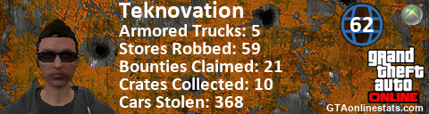 [URL=http://GTAonlinestats.com/showplayer/Teknovation][IMG]http://GTAonlinestats.com/randomsignature/Teknovation/sig.png[/IMG][/URL]